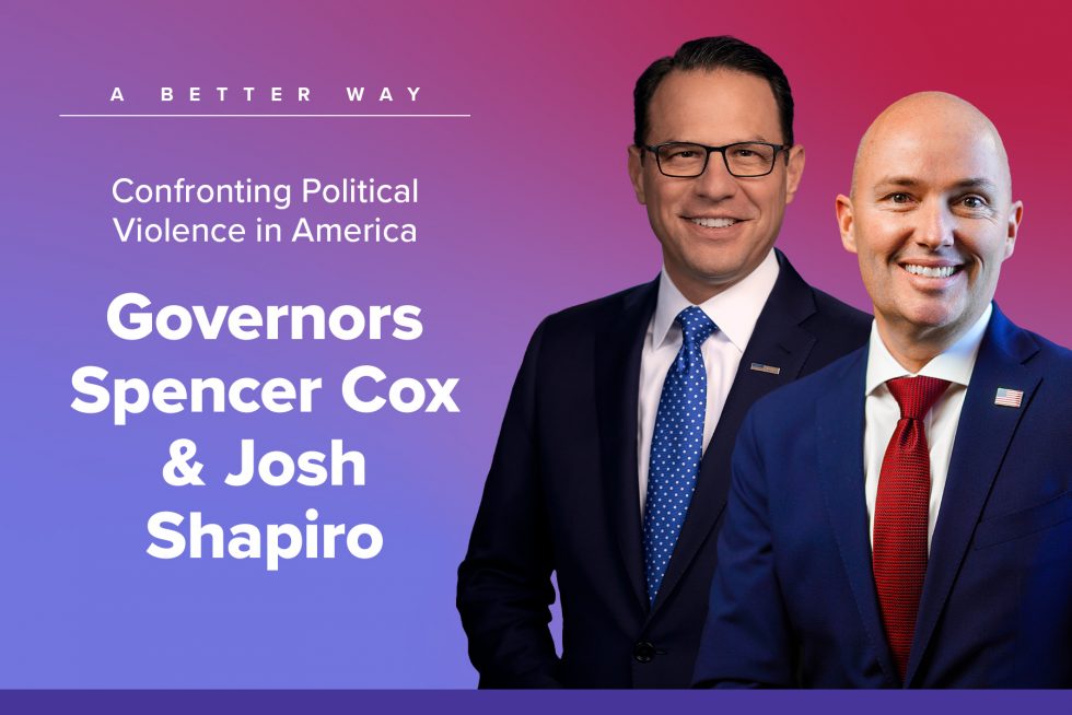 On December 9, Utah Governor Spencer Cox and Pennsylvania Governor Josh Shapiro join for a timely conversation on the rising threat of political violence. In this moment of deep division, two leaders from opposite political parties will discuss the dangers of extremism, the responsibilities of leadership in moments of crisis, and more. Livestream option available.